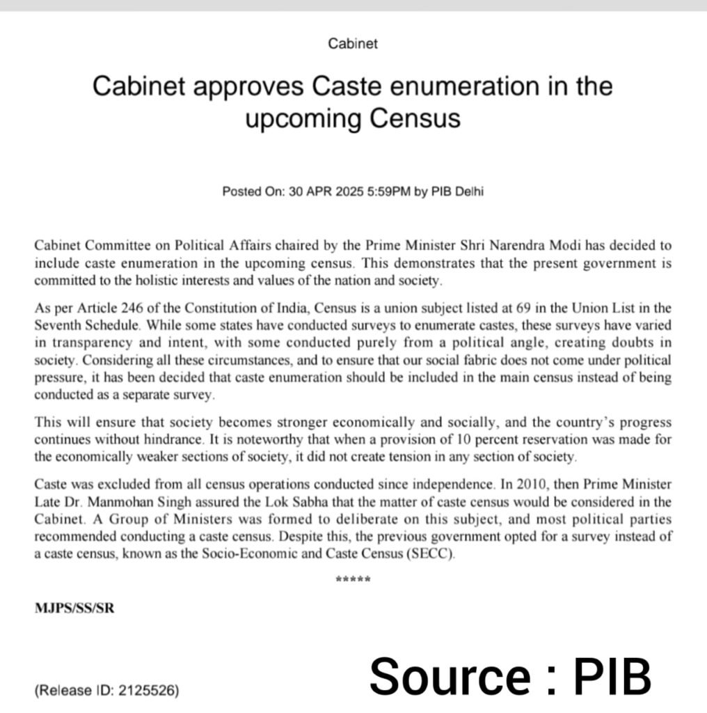 New Delhi, April 30, 2025 — Union Minister Ashwini Vaishnaw on Wednesday announced that the Union Cabinet has decided to incorporate caste enumeration in the upcoming national census. The Cabinet Committee on Political Affairs, chaired by Prime Minister Narendra Modi, made the decision.
